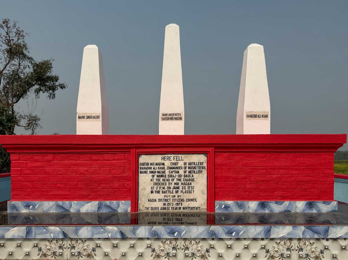 Two hundred and sixty-eight years ago, in the rainy June of 1757, this tranquil ground was a battlefield — though barely. Here's where the Battle of Plassey was fought, and it was only half a battle. The match had been fixed beforehand, by Robert Clive and the Nawab's general Mir Jafar, and the powerful banking family of the Jagath Seths, in the house of the latter. A portion of the Nawab's army fought, while a larger portion that was under Mir Jafar's command stood passive, and walked away after a time. The Nawab fled, was eventually captured, and duly hacked.