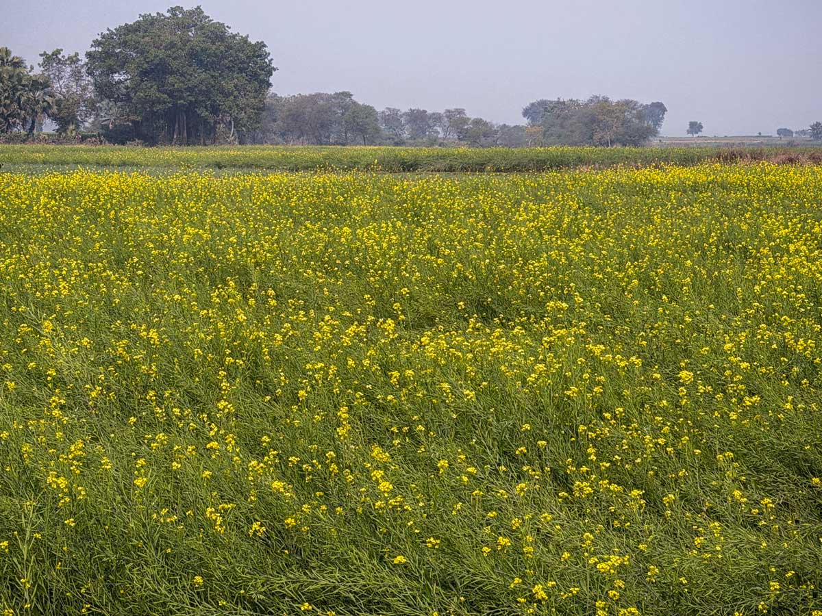 There were mango trees, tall and wide-canopied and very old. And there were cries of the Green Bee-eater, the Black-naped Monarch, the Blue-throated Barbet, the Eurasian Collared-Dove, the Black-hooded Oriole, the White Wagtail, and the Greenish Warbler. I walked on a bund, by a tank with trees around it, and fields on one side all the way out to the bending sky. The soil wasn't red or black like in the south where I live; here it was the colour of ash, but extremely fertile, and made more fecund by superb irrigation. Now in January, the fields were awash with the blazing yellow of mustard blossoms. There was no haze and no cloud that could dull their colour.